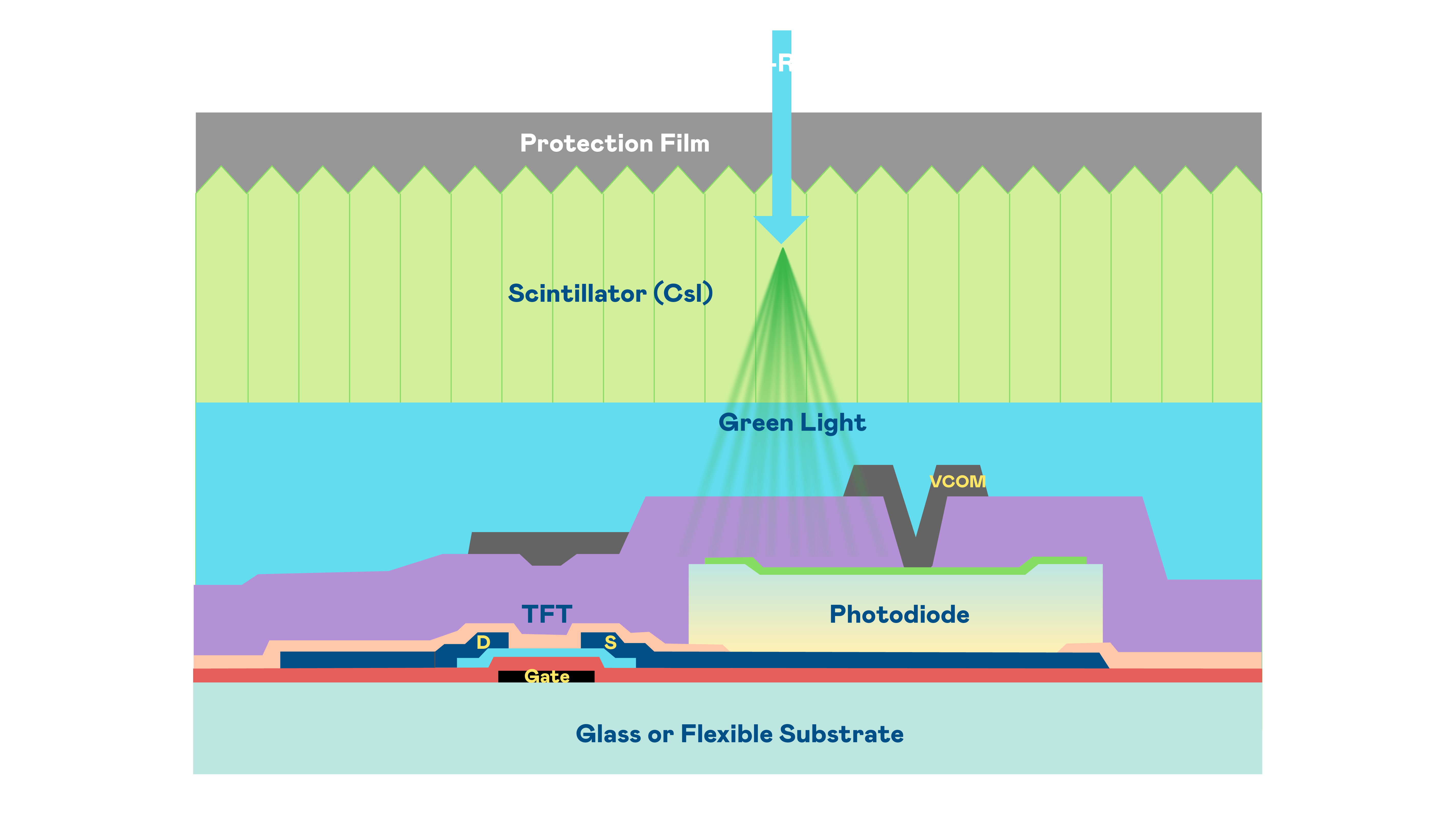 hth华体育官网网页版的X光影像感測陣列使用薄膜電晶體 (TFT) 作為每個像素的讀取開關,搭配光電二極體(Photodiode)的光電轉換元件,用以感測X光影像訊號。